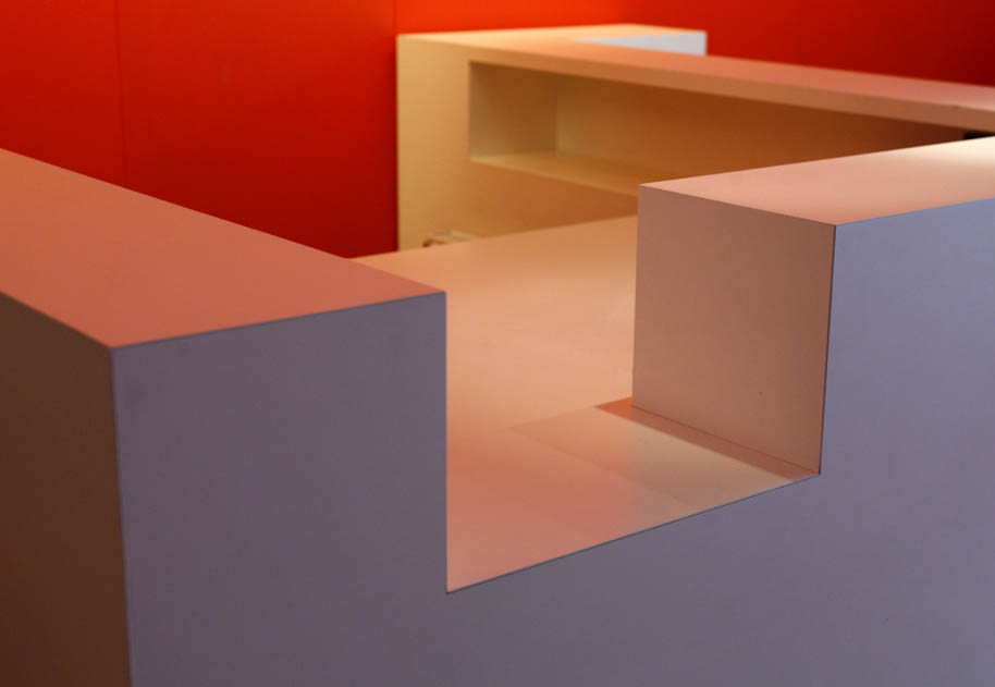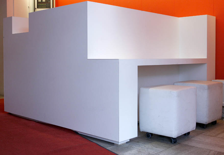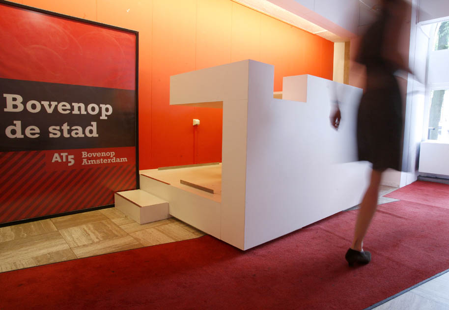 De opgave is om een ontwerp voor de entree en receptiebalie van de Amsterdamse nieuws en actualiteiten zender At5 te maken. De bestaande balie is sterk verouderd en voldoet al lange tijd niet meer aan de moderne eisen. Het nieuwe entreegebied moet de dynamiek van At5 uitstralen. De receptioniste is zowel telefoniste als gastvrouw. In het ontwerp is de vloer van de receptiebalie verhoogd, zodat de receptioniste en de passerende bezoekers dezelfde ooghoogte hebben. Dit is prettiger voor beiden en het is ergonomisch voor de receptioniste. Ook is er een plek waar de bezoekers rustig kunnen wachten, hun espresso drinken en tegelijkertijd de uitzending op het beeldscherm op de tegenoverliggende wand kunnen zien. Omdat de oppervlakte van het entreegebied zeer beperkt is, is de zitruimte voor bezoekers geïntegreerd aan de rechter zijde van het meubel. Daar vandaan heeft men goed zicht op het beeldscherm. De rode achterwand is de enige accentkleur in het interieur. Rood is ook de kleur van het logo van At5 en de kleur die staat voor de energie van At5.