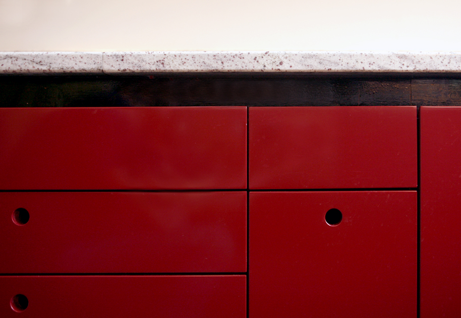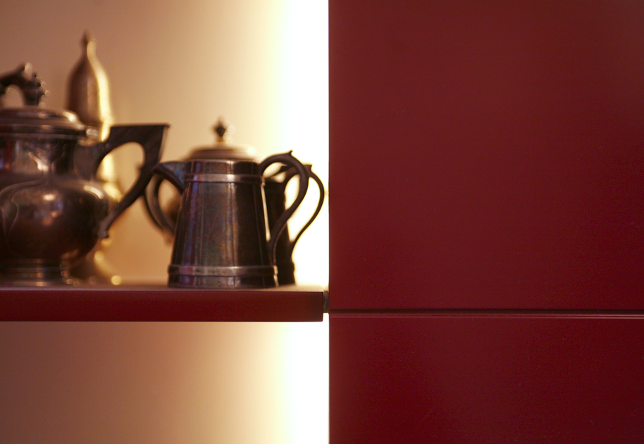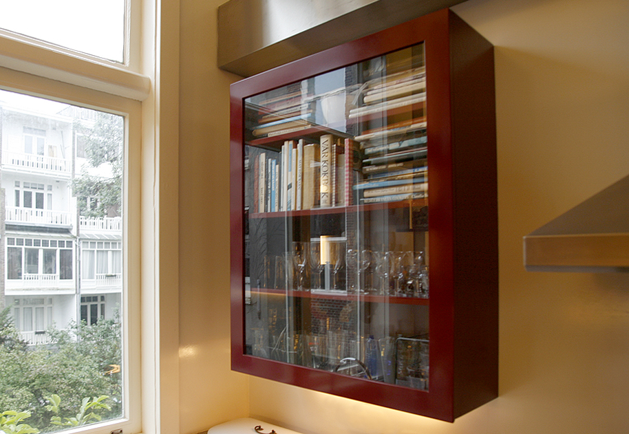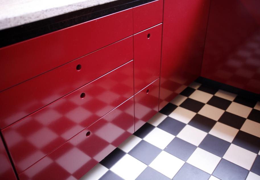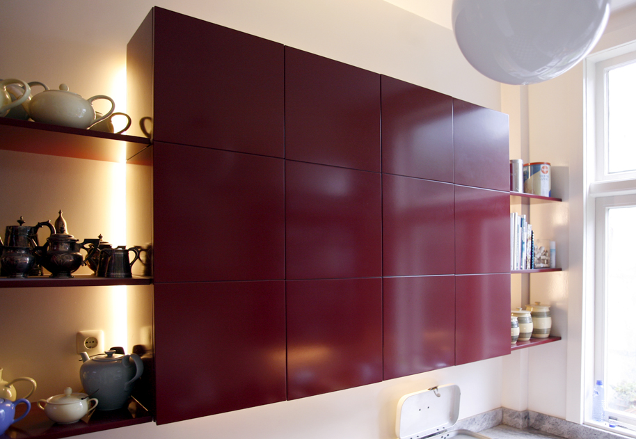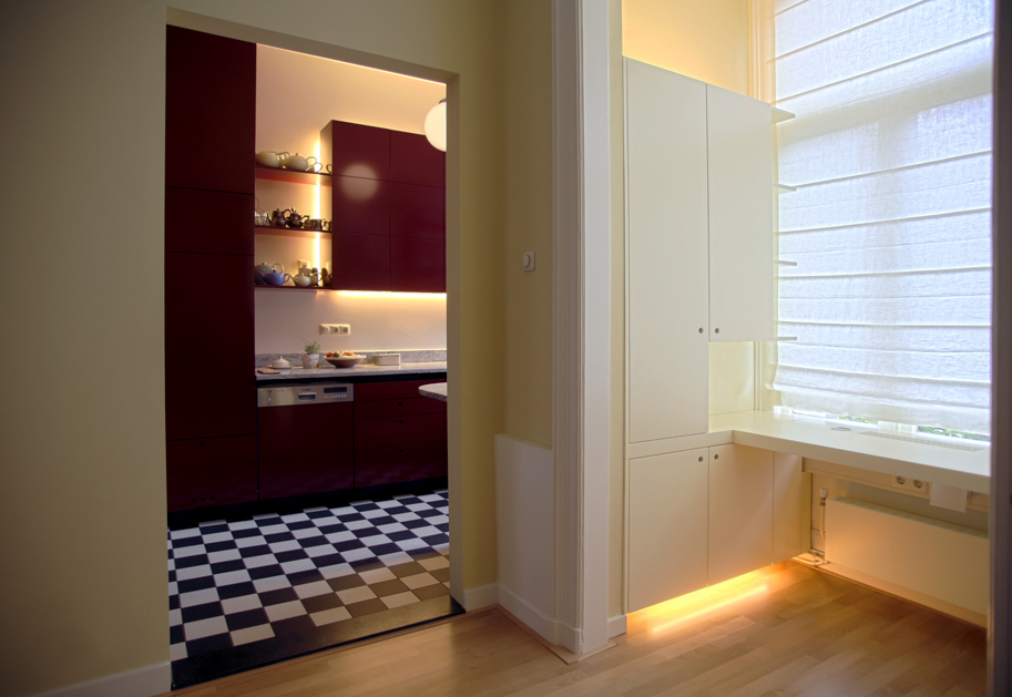 Zoals bij de meeste huizen uit het laatste decennium van de 19e eeuw is de klassieke indeling van de plattegrond twee kamers ensuite, een zijkamer en een gang met aan het einde de keuken. De keuken is dan een smalle ruimte van ca. 2,5 x 4 meter. Deze ruimte is alleen toegankelijk vanuit gang. In de nieuwe situatie is een directe verbinding gemaakt tussen de woonkamer en keuken, waardoor nieuwe zichtlijnen ontstaan en beide ruimtes heel ruimtelijk en licht worden. De keukenkasten worden gedeeltelijk voorzien van onzichtbare handgrepen en de verlichting is indirect in beide ruimtes. De muren in de keuken zijn afgewerkt met glad pleisterwerk dat hoogglans is gelakt en daarom hygienisch. De toegepaste materialen , kleuren en licht zijn functioneel en efficient, maar passen ook heel goed bij de intieme sfeer van de huiskamer.