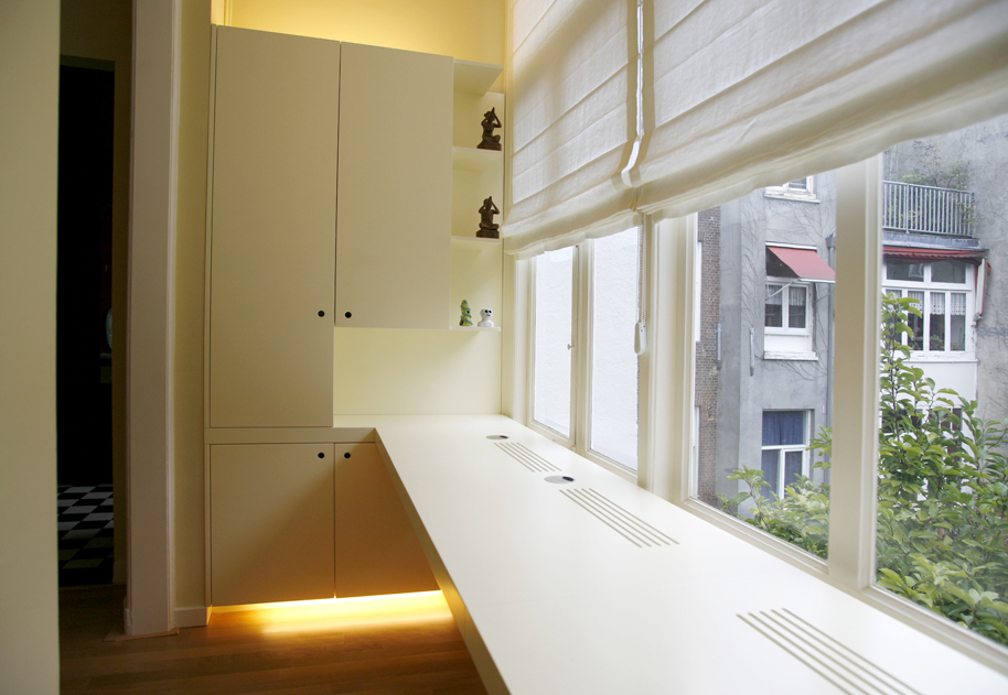 De opgave was om deze ruimte zowel functioneel als esthetisch een meerwaarde te geven, zodat het een aantrekkelijke plek zou worden om te verblijven. De functionele eisen waren een werkblad met twee werkplekken, voorzien van alle moderne technische aansluitingen en van een maximaal haalbare bergruimte. En tegelijkertijd een mooie beëindiging van de aangrenzende woonruimte.