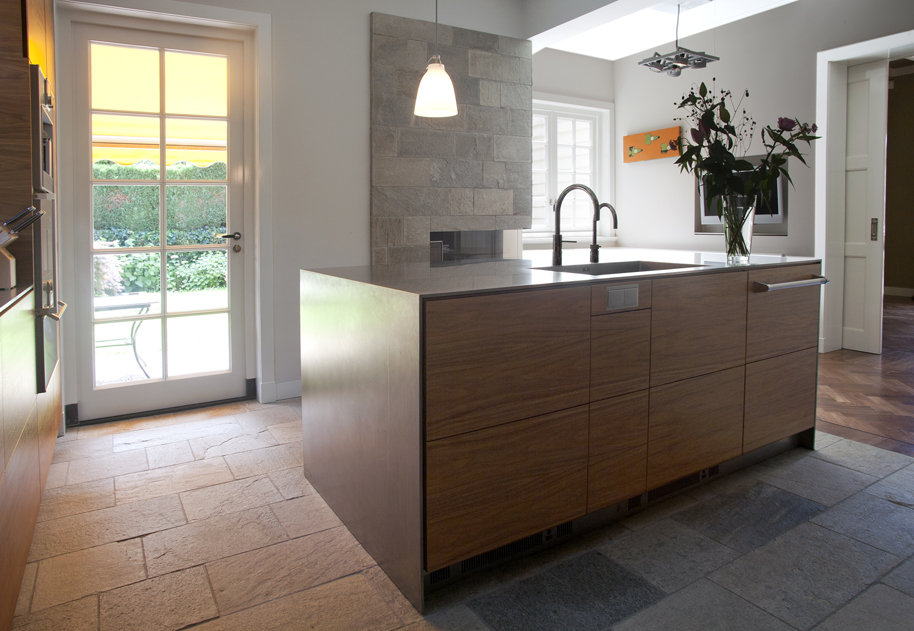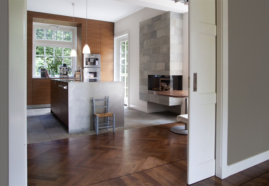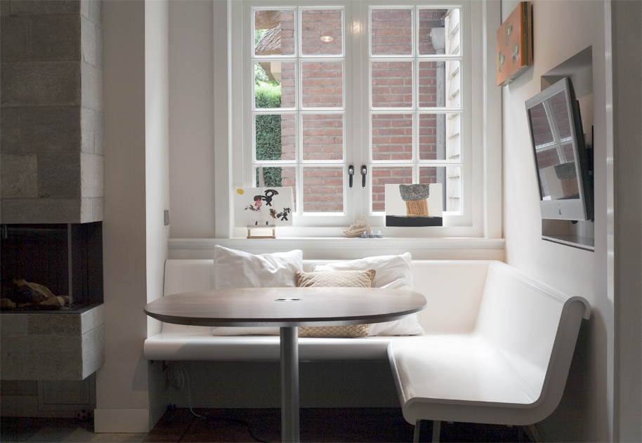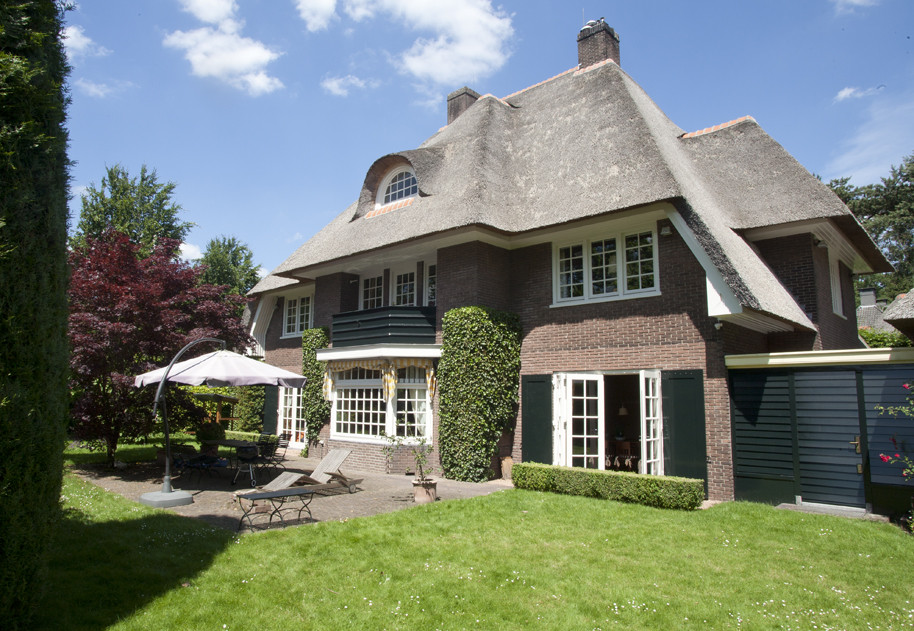 Klein landhuis met rieten kap ligt aan de rand van de Veluwezoom. Voor de renovatie ademde het huis nog de jaren dertig sfeer door het schaarse daglicht, de donkere kleuren en de kleine ruimtes. De toegang tot de tuin was beperkt. Een blanke huid was toen mode en de tuin diende voor een mooi uitzicht. De wens van de opdrachtgevers was om de indeling te transformeren tot een plek met een open ruimtelijk karakter. Om dit te bereiken worden brede doorgangen tussen de voormalige dienstvertrekken ( keuken, provisiekamer) en de eetkamer gemaakt, borstweringen worden weggebroken en vervangen door driedelige openslaande deuren. Zo ontstaat een helder overzicht en ontstaan zichtlijnen van de keuken door de eetkamer tot in de tuin en ook van de hal tot in de keuken. In het hart van het huis is nu een open en ruime “living” ontstaan , waar de functies koken, eten en huiswerk maken verenigd zijn. Voor het verblijf tijdens “prime time” is in de luwte van de open haard een rustige plek gemaakt om huiswerk te maken of te relaxen. Voor deze plek zijn een hoekbank en organische gevormde notenhouten tafel ontworpen. Het interieur is tijdloos door alle accessoires, radiatoren, roosters en apparatuur te integreren in het meubilair. De wanden zijn licht geschilderd om het daglicht zoveel mogelijk binnen te halen. Er is gekozen voor materialen uit de natuur zoals de roestvrijstalen werkbladen, notenhouten en zandkleurige ruwe vloeren van Kwartsiet. De materialen en de mensen geven het huis kleur. "Less is more"