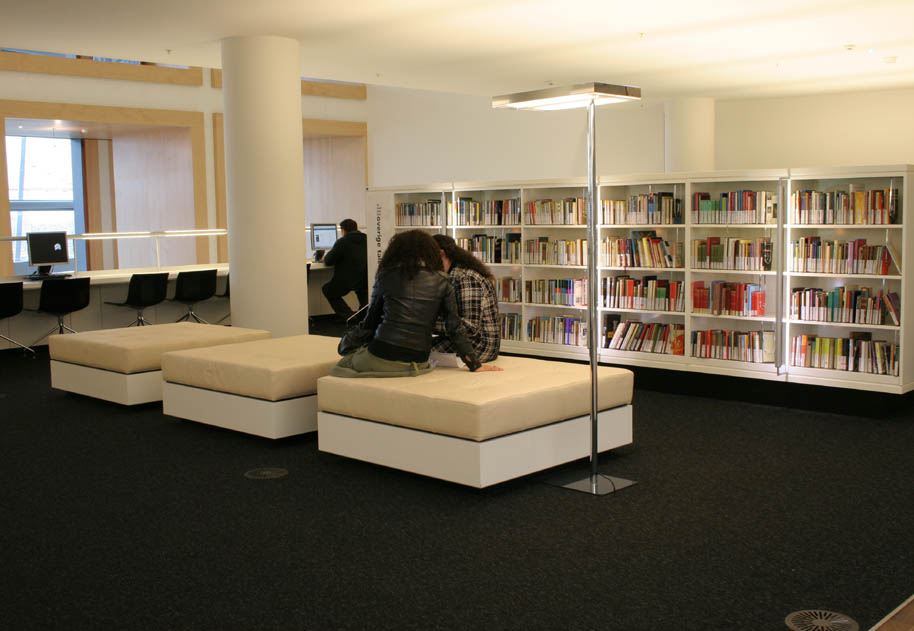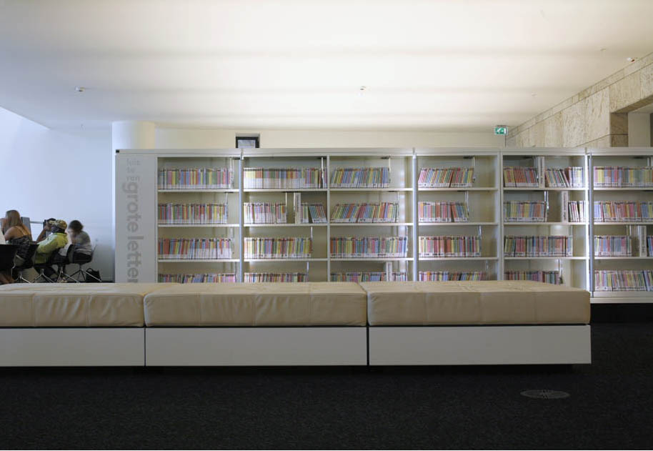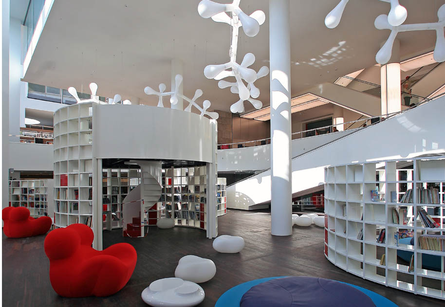 De grote rode voorleesstoelen van Gaetano Pesco in de jeugdbibliotheek zijn niet alleen gekozen vanwege hun ronde vormen, maar ook vanwege hun grote formaat. De enorme ruimte vraagt om meubilair dat zicht wat maat betreft met haar verhoudt. Voor de moeders met baby’s is het ronde eiland met in het midden een groot kussen ontworpen. De moeders kunnen op brede rand van het eiland zitten en leggen hun baby op het grote kussen in het midden te slapen. Ook kunnen de grotere kinderen in hun ideale positie , namelijk liggend, lezen. De witte zitstenen zijn niet groot, maar vormen met elkaar verspreid over de gehele vloer samen een groter geheel en gaan door hun kleur en materiaal een relatie aan met het lichtobject in de vide. Beiden zijn gemaakt van witte kunststof. De organische vormen van het meubilair zijn functioneel, want ravottende kinderen lopen minder gevaar zich te bezeren tegen iets dat rond is! Het lichtobject bestaat ook uit organisch gevormde elementen. Het lijken schematische chromosomen, die zich vertakken door de hele vide boven de jeugdafdeling. Zij vormen samen een enorm lichtobject.