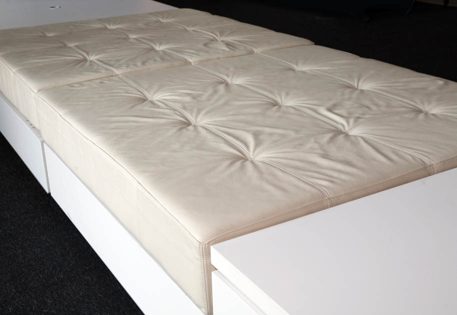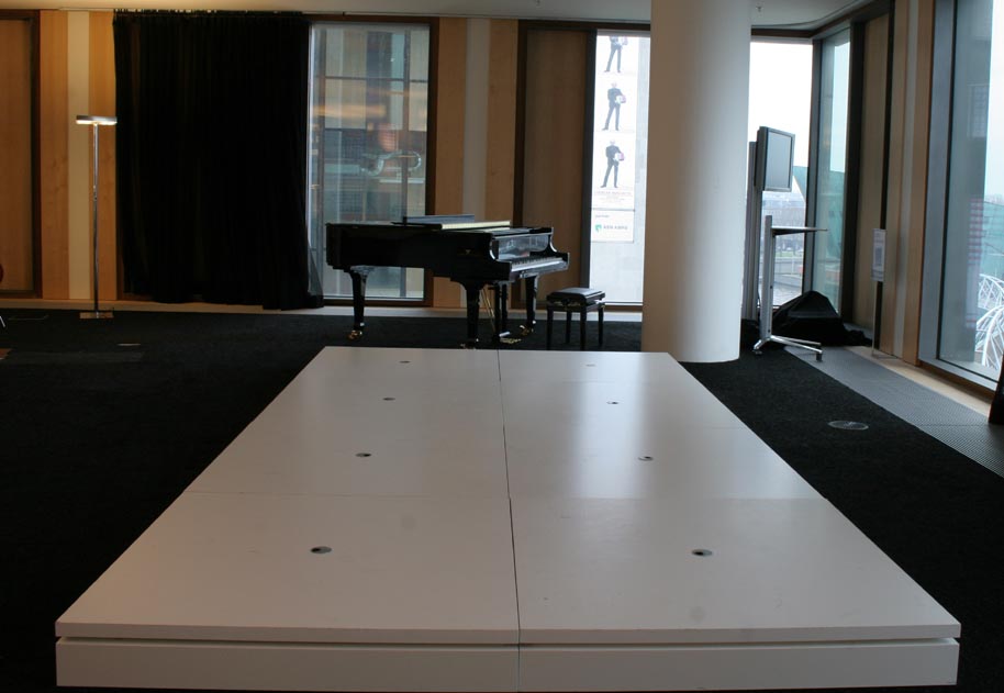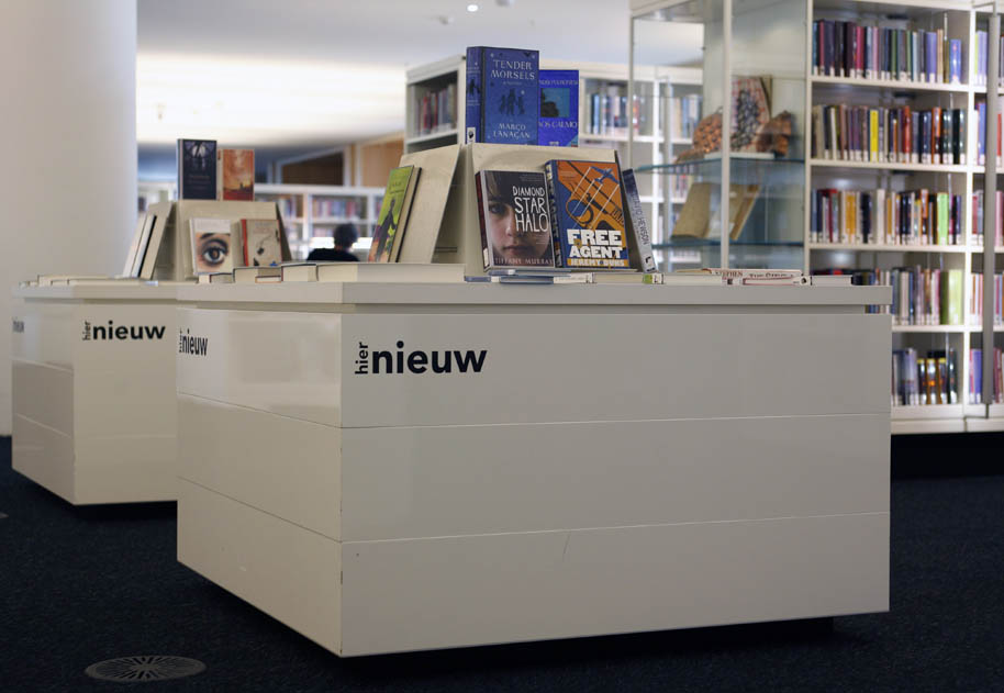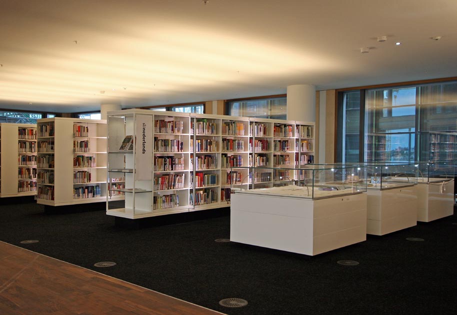 De opdrachtgever wil plekken in het gebouw creëren waar diverse activiteiten op kleine schaal plaats kunnen vinden. Het idee is dat deze plekken zullen bruisen van de activiteit. Ze worden de “ pleinen” genoemd en krijgen namen van thema’s die verbonden zijn met de betreffende collectievloer zoals het Muziek, Cultuur- en Reizenplein. De pleinen zijn gelegen aan de zuidkant van de bibliotheek met uitzicht op het Binnen IJ en de stad.De opgave voor het meubilair is dat het flexibel en multifunctioneel is. Er kan een expositie mee ingericht worden, een talkshow op georganiseerd worden, een lezing of concert op gegeven worden. Bovendien zal ieder plein door de inrichting een eigen identiteit hebben.Het ontwerp resulteert in verschillende modulaire elementen met een maat van 120 x 120 cm. Voor iedere functie kan met behulp van de modulaire elementen een speciaal meubel samengesteld worden zoals een podium, een bank met zijtafels, displaytafels of vitrines. De elementen kunnen gestapeld en geschakeld worden.De vitrines en displaytafels worden ingericht met het thema van het plein en verlenen de identiteit aan het plein. De vitrines zijn opgebouwd uit twee gestapelde podium elementen met daarop een glazen module, waarvan de bodem uittrekbaar is, zoals een lade. Hierdoor is de vitrine eenvoudig in te richten. De kussens, die op de podia geplaatst kunnen worden, vormen zitelementen en kunnen in de lengte geschakeld worden aan zijtafels. Als er niets georganiseerd wordt, kunnen mensen hierop relaxen en zittend of liggend lezen.