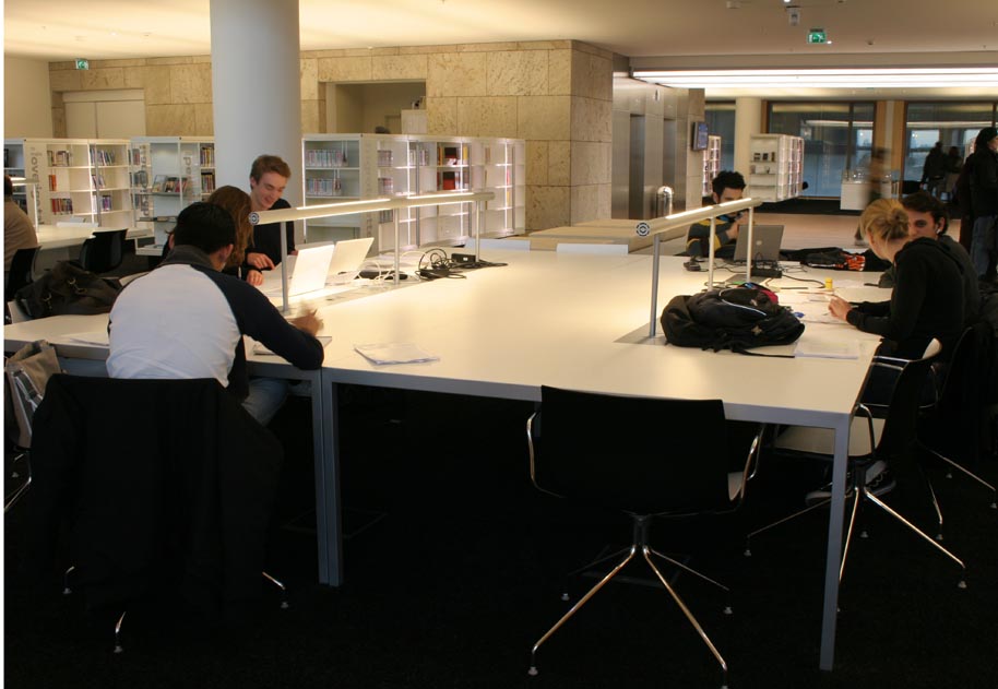 Op de collectievloeren nemen de leestafels een belangrijke plaats in. De verlichting hierop is speciaal ontworpen voor deze bibliotheek en is ook aangebracht boven alle werkbladen langs de vides. De kleur van de tafels is wit en vormt hierdoor een familie met al het andere meubilair op de collectievloeren, zoals de werkbladen, stoelen om de vide, de boekenkasten en de balies.