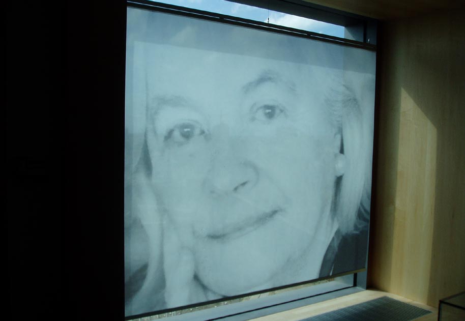 Grote verlichte dia’s in de gevel