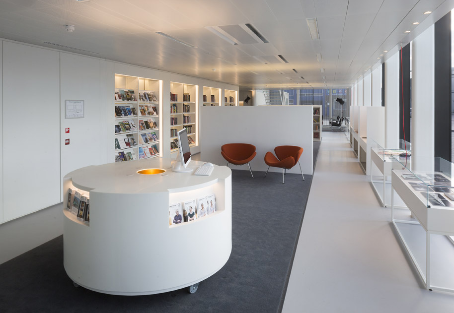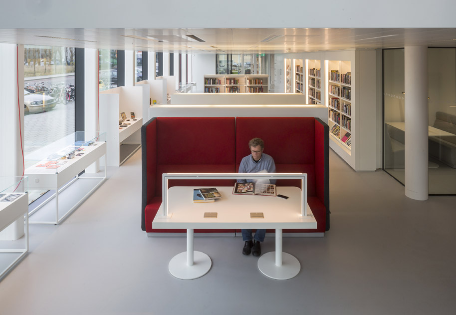 De publieke ruimte van het nieuwe Collectiecentrum van EYE in Amsterdam Noord is een bibliotheek met een grote verzameling filmboeken en tijdschriften. Maar ook is het een comfortabele rustige plek om te lezen, onderzoek te doen en meer dan 9000 gedigitaliseerde films direct te bekijken.
