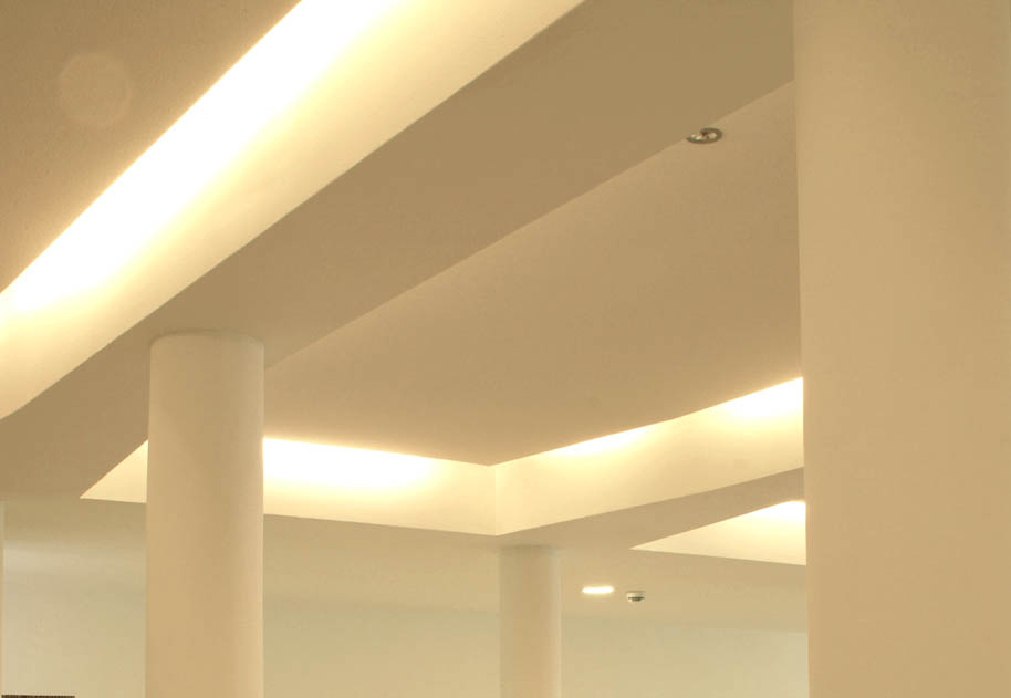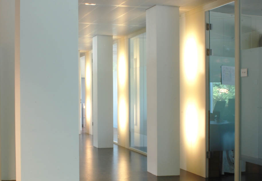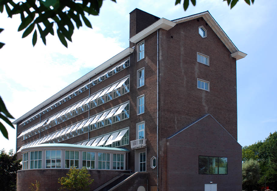 In de bouwdelen aan achtetrzijde van de hal wordt de indeling van de voormalige laboratoria gesloopt en komen de kantoorruimtes, vergaderruimtes en een kleine bibliotheek. De vloeren worden eenvoudig en strak in een kleur afgewerkt. De gangverlichting is achter de kolommen aangebracht en reflecteert het licht indirect via de wand. De glazen puien scheiden de kantoorruimtes akoestisch van de verkeerzone en zorgen voor een gevoel van ruimte. De werkruimtes worden van elkaar gescheiden door een flexibel wandsysteem. De wanden en binnenzijde van de gevel worden in de kleur wit afgewerkt, zodat gevel en wanden een geheel vormen en de ruimtes licht zijn. Om de ruimtes zoveel mogelijk verschoond te laten zijn van technische elementen zoals verlichtingsarmaturen, kabelgoten en radiatoren is de verwarming en verlichting geïntegreerd in het vlakke metalen plafond en zijn de kabelgoten zo gedetailleerd dat ze in een vlak liggen met de gevelwand. Aan de zuidkant laten licht gekleurde zonneschermen het zonlicht diffuus naar binnen vallen op de werkplekken.